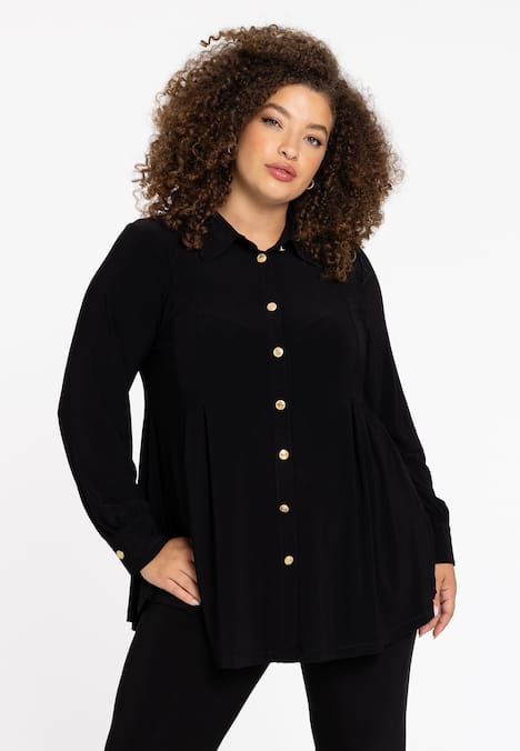 Deze essentiële dolce blouse heeft prachtige gouden knopen die een vleugje luxe toevoegen. De getailleerde stolpplooien zorgen voor een flatterend silhouet en zorgen voor een comfortabele pasvorm. De halslijn met kraag en lange mouwen met manchetten met knopen maken het tot een veelzijdig kledingstuk, ideaal voor zowel professionele als casual omgevingen. Combineer deze blouse met onze Tregging Jones om de look compleet te maken!