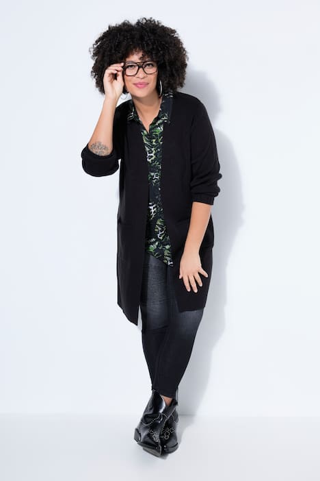Vest, lang en recht, open model, geribbeld breisel