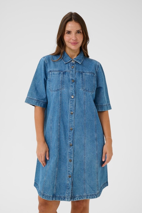 Denim jurk met een rechte, licht uitlopende pasvorm en zichtbare verticale naden. Voorzien van een kraag, volledige knoopsluiting met metalen knopen, halflange mouwen en twee borstzakken. De textuur oogt gestructureerd en typisch denim.