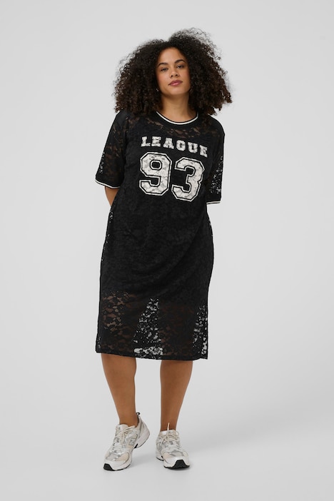 T-shirtjurk met rechte, ontspannen pasvorm en knielengte. Volledig gemaakt van transparant bloemenkant, korte mouwen en een ronde geribde halslijn met contrasterende bies. Zijsplit zichtbaar aan de onderkant.