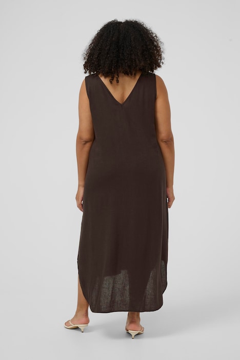 Mouwloze midi-jurk met een ontspannen pasvorm, V-halslijn en subtiele high-low zoom. Zachte, ademende stof biedt comfort voor elke dag en gelegenheid.
