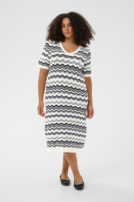 Deze gebreide jurk heeft een recht model met midi-lengte en een golvend opengewerkt patroon over het hele item. Voorzien van korte mouwen, een ronde halslijn en dezelfde afwerking aan de randen.