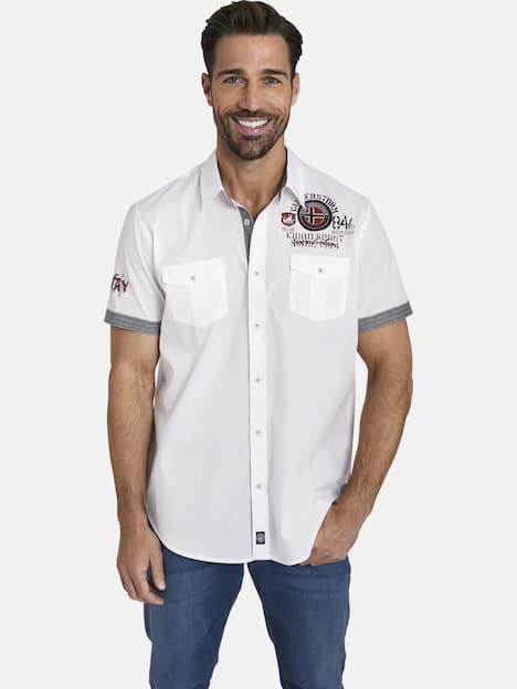 JAN VANDERSTORM is uw expert voor herenmode in grote maten. Dat men er ook 's zomers goed uit kan zien, bewijst het overhemd met korte mouwen SNOFRED – met markante cargo-borstzakken met klep en knoop, met contrasten op de kentkraag en knoopsluiting en met een patch en prints op de linkerborst en rechtermouw. Maar SNOFRED bewijst vooral dat de comfort fit van JAN VANDERSTORM ook bij zeer hoge temperaturen erg lekker zit. Misschien wilt u dat zelf eens uitproberen? 100% katoenen popeline. Geschikt voor de wasmachine. ARTIKEL +FIT: comfortabel model uit onze +Fit-collectie. Dankzij ons speciale model +Comfort is dit comfortabele kledingstuk aan de voorkant langer en wijder. Daardoor biedt het optimale bewegingsvrijheid.