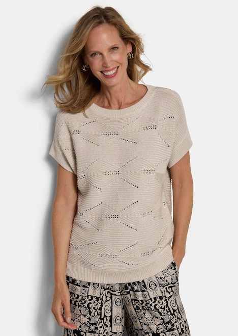 Pullover van chic ajourtricot: de dwarsgeribde structuur met een ruitmotief krijgt door ingewerkt Lurex-garen een stijlvolle glans. Met boothals en aangebreide mouwen die bovenarmen bedekken. Ongecompliceerde katoenmix – als tricot pullover of slip-over te combineren. Lengte ca. 65 cm in maat 46, ca. 61 cm in maat 23.