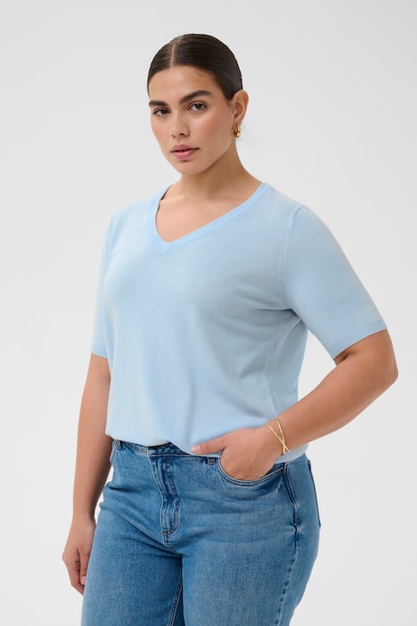 Deze V-hals trui heeft een tijdloze, normale pasvorm en mouwen tot aan de elleboog voor veelzijdig dagelijks gebruik. Zachte, lichte stof biedt comfort, terwijl de ribboord zorgt voor een nette afwerking.