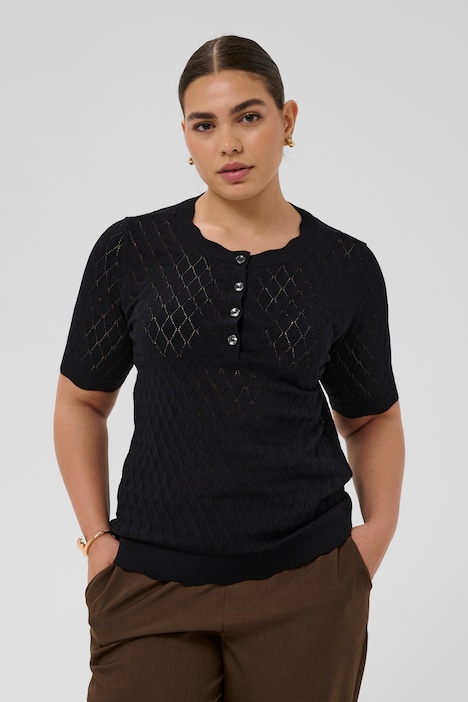 Deze fijngebreide top met korte mouwen heeft over het hele oppervlak een ruitstructuur. De top heeft een ronde halslijn met ribboord, een rechte pasvorm en een knoopsluiting met vier knopen op het voorpand. De ribgebreide boorden zorgen voor een duidelijke afwerking aan hals, mouwen en zoom. De stof oogt zacht en open van structuur.