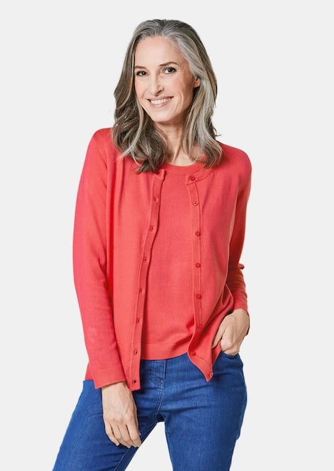 Twinset, voor vele combinatiemogelijkheden. Perfect voor dagelijks gebruik en natuurlijk kunnen het tricot jasje met lange mouwen en de pullover met korte mouwen ook apart worden gedragen. Het zachte materiaal met veel viscose biedt zeer veel draagcomfort. Mooi zijn de ribboorden aan de mouwen en onderlangs. Lengte tricot jasje/pullover ca. 67/63 cm in maat 46, ca. 63/59 cm in maat 23.
