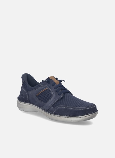 Ontdek de JOSEF SEIBEL New Anvers 24, een herenhalfschoen in stijlvol nachtblauw-kombi. Met handgenaaide vakmanschap biedt deze schoen niet alleen duurzaamheid maar ook comfort met de Bequemschuhweite K. Het verwisselbare voetbed, gemaakt van hoogwaardig leer, zorgt voor extra gemak en hygiëne. Het bovenwerk combineert leer en textiel, terwijl het interieur van textiel is, wat bijdraagt aan een ademende en comfortabele pasvorm. De PU-zool garandeert grip en stabiliteit. Een praktische vetersluiting maakt deze schoen ideaal voor dagelijks gebruik. Perfect voor de moderne man die stijl en comfort waardeert.