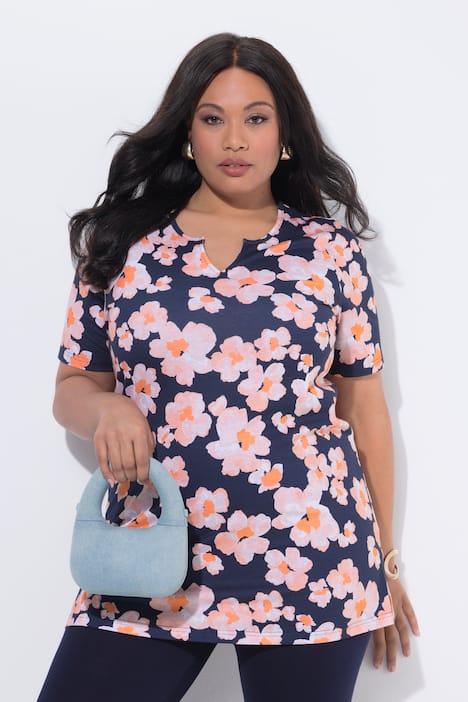 Longshirt, bloemen, A-lijn, tuniekhals, korte mouwen