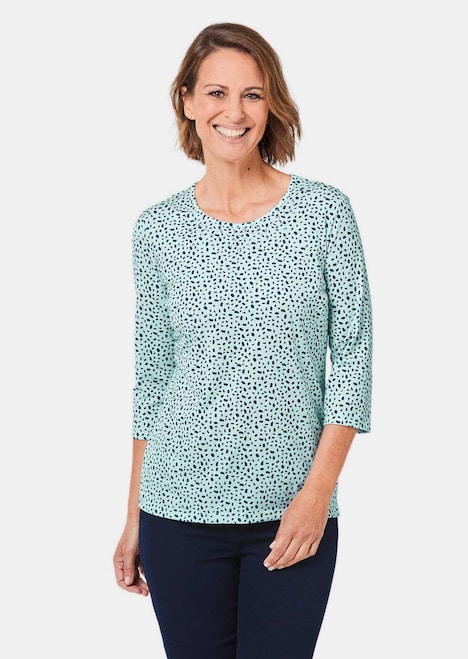 Gedessineerd shirt met minimal-print in frisse kleuren, die zich bijzonder mooi laten combineren. De ronde hals is met kleine metalen lovertjes gegarneerd. Onderhoudsvriendelijk. Met 3/4-mouwen. Lengte ca. 66 cm in maat 46, ca. 62 cm in maat 23.