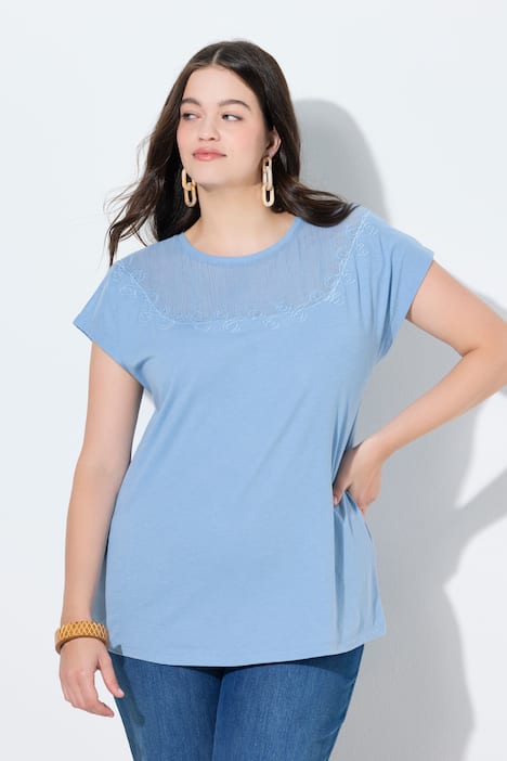 T-shirt, gehaakt inzetstuk, ronde hals, korte mouwen, biologisch katoen